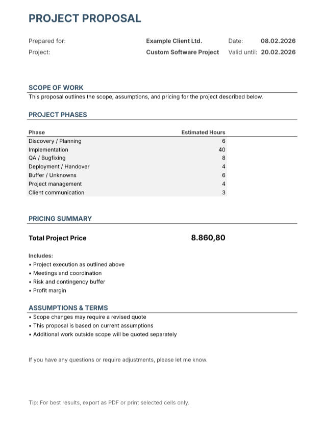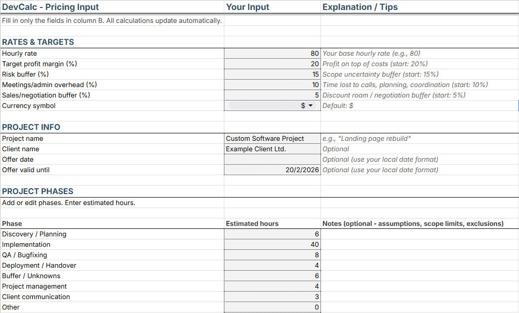 DevCalc is a structured fixed-price pricing system for freelance developers who want predictable margins and client-ready proposals.